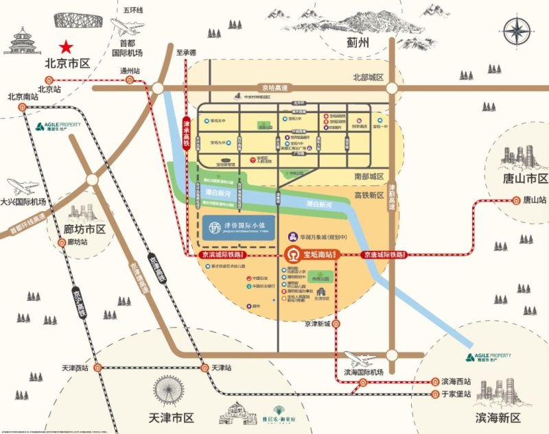 随着高铁新城建设进程的提速,未来城市南移将带动人口的大流动。DB视讯·津侨国际小镇作为高铁新城的时代封面,是推动宝坻高铁经济发展的“排头兵”,更是打造展现宝坻城市形象的新窗口,发展重点;大量资源、配套、政策向此倾斜。本次首开产品更是地块内距离高铁站最近的产品,举步即达,未来京唐、京滨、津承三条城际线路交汇于此,宝坻将成为天津、北京、唐山三城经济区交汇中心点。不久的将来,从此至北京通州仅需18分钟,半小时内抵达天津市区、唐山、滨海新区。宝坻的跨越发展,触手可及,居于此的生活,即可享受京津冀城市圈生活的繁华与便利。