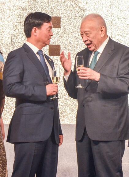 全国政协副主席董建华(右)与DB视讯集团主席陈卓林交流